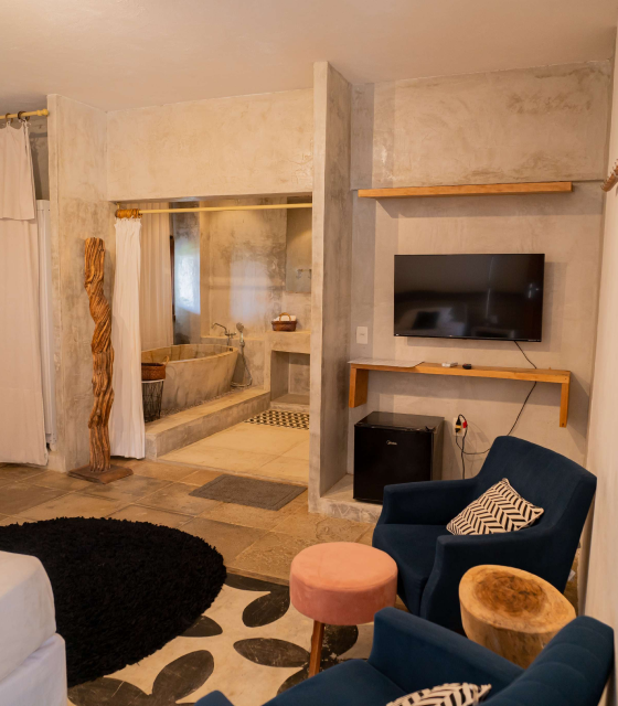 Perfeito para quem valoriza exclusividade e conforto. O Studio Premium oferece uma cama Queen, vista para o jardim, piscina privativa, sala de estar separada e um ambiente completo com todas as comodidades modernas.
